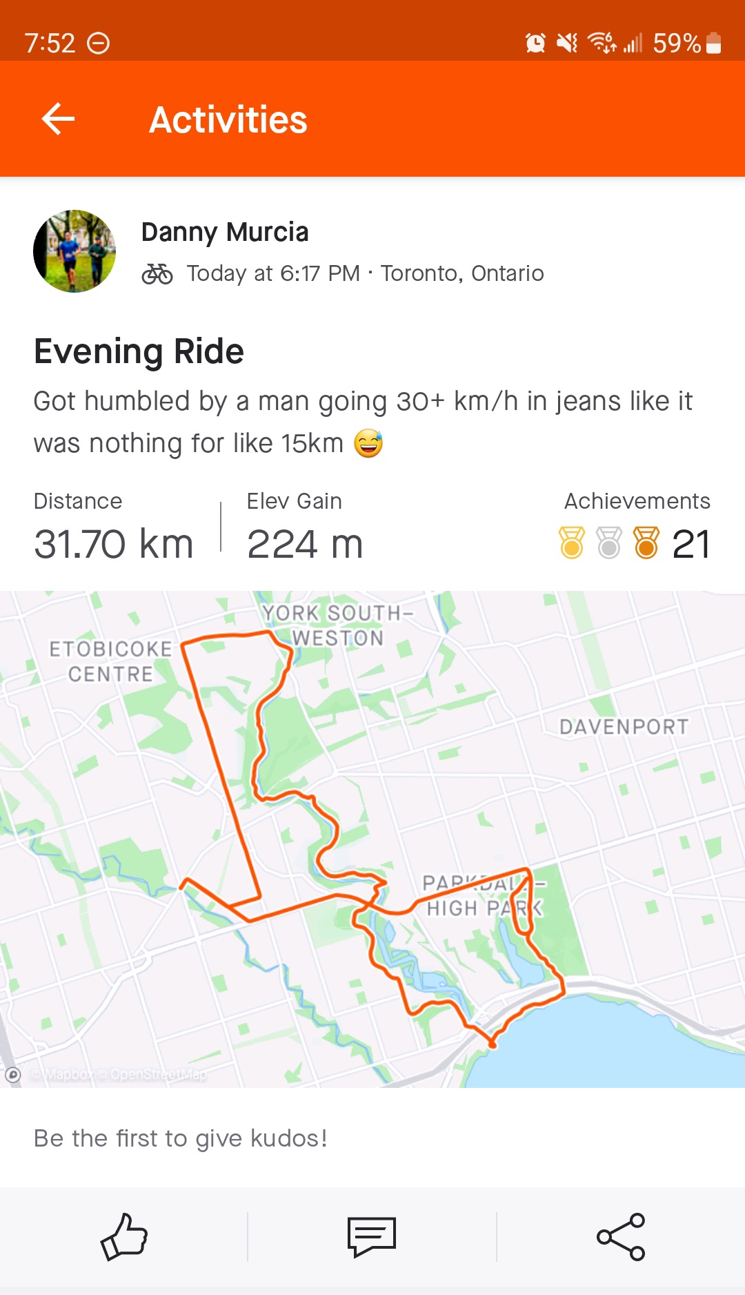 I started commuting on my bike since the weather turned nice up here. Last night on the way home, I was following this kid wearing a full spandex kit on the bike trail. I was wearing Converse, jeans and a backpack. He seemed to tire out after a while so I pulled ahead and he drafted behind me. We never exchanged a word. I looked for his ride on Strava when I came home and found this, which made my day (the caption under Evening Ride):