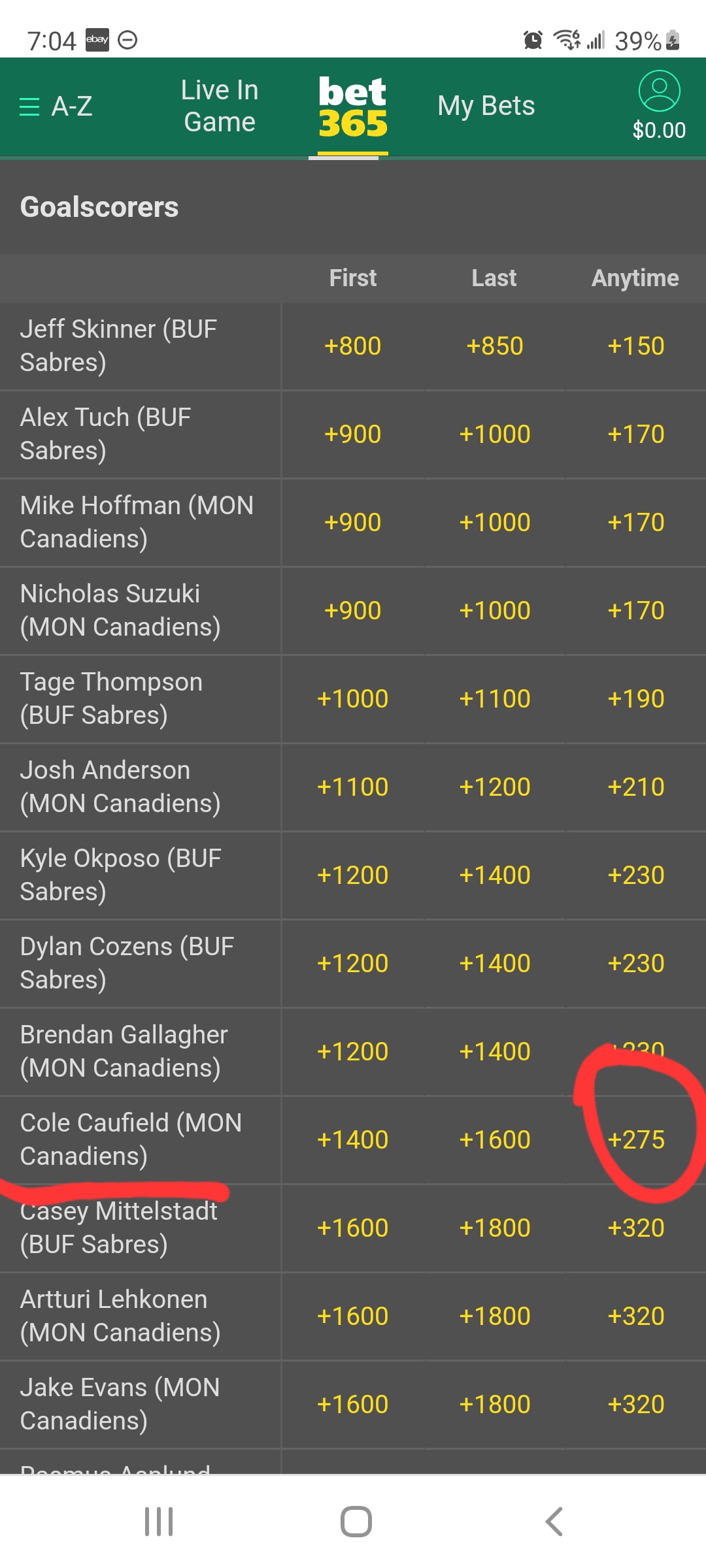 Cole Caufield scores a goal against the Sabres tonight +275 (bet365)