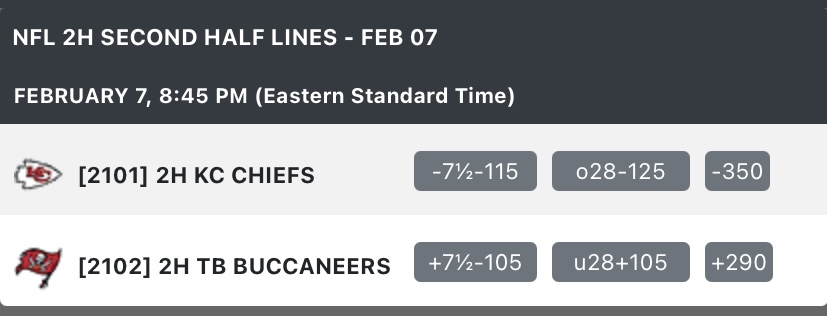 Chiefs -7.5 -115 SECOND HALF